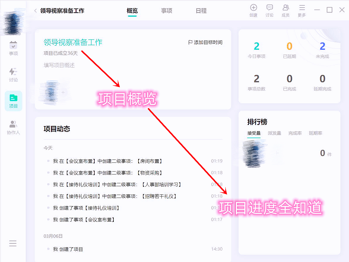 具体事项的进展动态不了解,便可借助飞项的项目概览功能,项目概览可全面了解该项目的完成情况及项目具体详情。同时通过项目概览可了解各团队成员的工作量以及工作进展,项目派发时可参照该数据进行项目任务的派发,避免造成任务多而难以按期完成的现象。