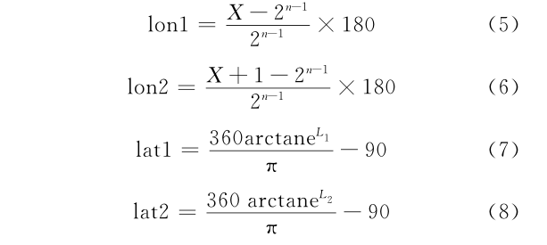 式中: lon1 、 lon2 、 lat1 、 lat2 分别表示行号为X 、列号为 Y 的瓦片的最小经度、最大经度、最小纬度、最大纬度; e为自然常数。 L1 、 L 2 的计算公式分别为