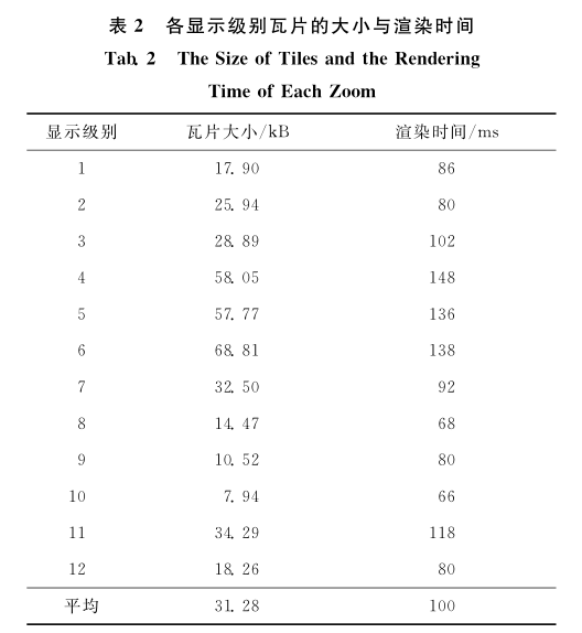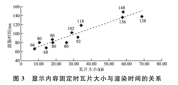 本文以上述模型组织生成的矢量瓦片为数据,运用node.js建立了一个矢量瓦片原型服务,并运用 web性能压力测试工具siege模拟15个用户在1 台台式机上( Inter Xeon CPU E3 - 1 241 , 8GB)测试首次获取矢量瓦片时(从服务器而不是从缓存中获取)的渲染效率。各级矢量瓦片的大小、显示内容及渲染时间的情况见表 1 。各级瓦片平均大小小于 100kB ,渲染耗费的平均时间为 175ms ,远小于 1 000 ms 。全 部 瓦 片 的 平 均 大 小 31.28kB<50kB ,平均渲染时间为 175 ms<300 ms ,满足2.1.2 节中的要求,可以快速地实现矢量瓦片的在线渲染。矢量瓦片的渲染时间主要包括瓦片的网络传输时间和瓦片数据渲染成图片的时间。为了确定瓦片大小与渲染时间的关系,固定显示内容,并测试瓦片的渲染时间,结果见表2 ,其散点图表示见图3 。从图3中可以看出在相同的网络条件下,当显示内容固定时,瓦片越大,耗费在网络传输上的时间越长,渲染时间就越长。通过对比表1和表2发现显示内容越多,渲染时间也越长。