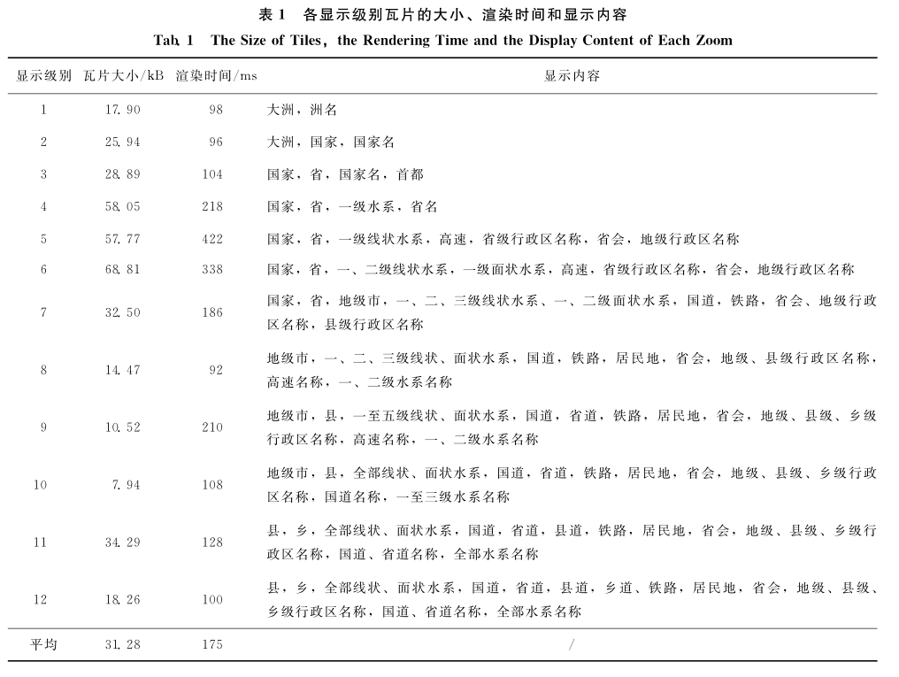 由于显示器的分辨率固定,人眼对事物的辨析能力、提取有效信息的能力有限 [11 ] ,在制图比例尺较小时显示较多的地理空间数据,会发生地理要素相互压盖,导致用户不能清楚地分辨地图所表达的信息。此时只需要显示能够表达要素的空间分布特征规律的部分数据即可,而不是显示所有数据;随着制图比例尺的增大,显示要素的数量随之 逐 渐 增 多、表 达 的 地 理 信 息 也 逐 渐 丰富 [12 ] 。虽然在之后的矢量瓦片渲染阶段可以通过自定义渲染样式控制图层的显示开关,筛选各图层的显示内容,控制对空间数据的表达,但是在显示级别较小时存储所有数据势必造成瓦片大小的增大,产生大量的数据冗余,导致网络数据传输量增大,影响系统性能及用户体验。因此,需要依据显示级别,对各图层的显示内容进行筛选,并对矢量瓦片设置以下要求:单张瓦片的大小必须小于100kB ,以确保每张瓦片的渲染时长不超过1 000ms ;瓦片的平均大小小于50kB ,平均渲染速率小于300ms 。地理数据的精度和数据内容的多少是影响瓦片大小的两大重要因素。其中数据精度对应于数据的比例尺,比例尺越大,数据的精度越高,数据量也越大。因此,首先要确定源数据比例尺与矢量瓦片显示级别之间的对应关系, 1∶100万的源数据对应瓦片1~8级,1∶25万对应9~10级,等等。其次对瓦片各级别的显示内容进行选取。数据内容的选取要按照整体到局部、从主要到次要、从高级到低级、从大到小的顺序进行。当显示级别较小时,只显示主要的、高级的、大型的事物,随着显示级别的提高,再依次显示次要的、低级的、小型的事物,最后还要从整体上进行分析,观察是否反映了制图区域的总体特征。
