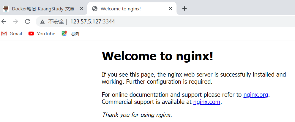 # -p 3344:80把内部的80映射到外部的3344,从公网的3344可以访问docker里的80