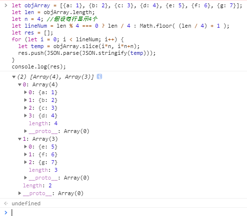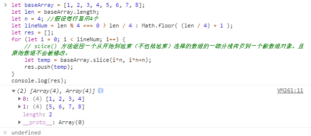 let baseArray = [1, 2, 3, 4, 5, 6, 7, 8]; let len = baseArray.length; let n = 4; //假设每行显示4个 let lineNum = len % 4 === 0 ? len / 4 : Math.floor( (len / 4) + 1 ); let res = []; for (let i = 0; i < lineNum; i++) { // slice() 方法返回一个从开始到结束(不包括结束)选择的数组的一部分浅拷贝到一个新数组对象。且原始数组不会被修改。 let temp = baseArray.slice(i*n, i*n+n); res.push(temp); } console.log(res);