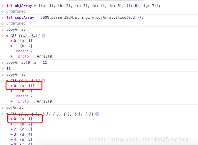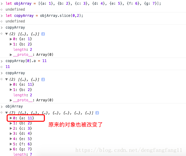 当数组元素为对象的时候,就不能使用slice方法进行截取了,因为slice属于浅拷贝,导致的问题就是你修改了新生成的数组对象值,会影响原始数组中对象的值,就比如下。但很多时候我们并不想影响原来的值。