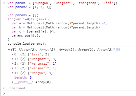 var param1 = ['wangwu', 'wangmazi', 'zhangshan', 'lisi']; var param2 = [1, 2, 3]; var params = []; for(var i=0;i<5;i++) { var a = Math.ceil(Math.random()*param1.length) -1; var b = Math.ceil(Math.random()*param2.length); var c = [param1[a], b]; params.push(c); } console.log(params);
