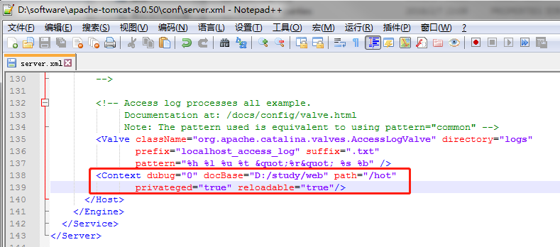 <Context dubug="0" docBase="D:/study/web" path="/hot" privateged="true" reloadable="true"/>