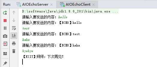 先启动AIOEchoServer.java,再启动AIOEchoClient.java,运行效果如下: