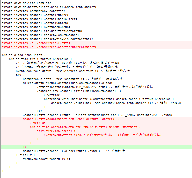 package com.bijian.netty.client; import com.bijian.netty.info.HostInfo; import com.bijian.netty.client.handler.EchoClientHandler; import io.netty.bootstrap.Bootstrap; import io.netty.channel.ChannelFuture; import io.netty.channel.ChannelInitializer; import io.netty.channel.ChannelOption; import io.netty.channel.EventLoopGroup; import io.netty.channel.nio.NioEventLoopGroup; import io.netty.channel.socket.SocketChannel; import io.netty.channel.socket.nio.NioSocketChannel; import io.netty.util.concurrent.Future; import io.netty.util.concurrent.GenericFutureListener; public class EchoClient { public void run() throws Exception { // 1、如果现在客户端不同,那么也可以不使用多线程模式来处理; // 在Netty中考虑到代码的统一性,也允许你在客户端设置线程池 EventLoopGroup group = new NioEventLoopGroup(); // 创建一个线程池 try { Bootstrap client = new Bootstrap(); // 创建客户端处理程序 client.group(group).channel(NioSocketChannel.class) .option(ChannelOption.TCP_NODELAY, true) // 允许接收大块的返回数据 .handler(new ChannelInitializer<SocketChannel>() { @Override protected void initChannel(SocketChannel socketChannel) throws Exception { socketChannel.pipeline().addLast(new EchoClientHandler()); // 追加了处理器 } }); ChannelFuture channelFuture = client.connect(HostInfo.HOST_NAME, HostInfo.PORT).sync(); channelFuture.addListener(new GenericFutureListener() { @Override public void operationComplete(Future future) throws Exception { if(future.isSuccess()) { System.out.println("服务器连接已经完成,可以确保进行消息的准确传输。"); } } }) ; channelFuture.channel().closeFuture().sync() ; // 关闭连接 } finally { group.shutdownGracefully(); } } }