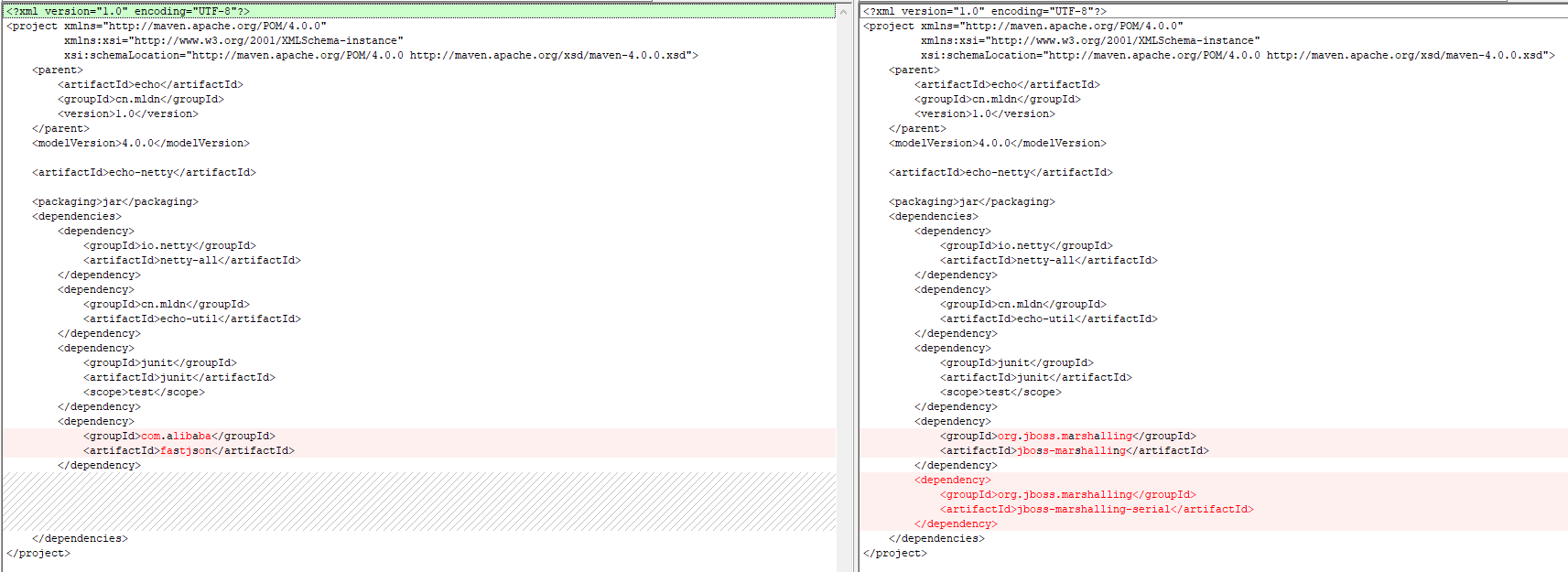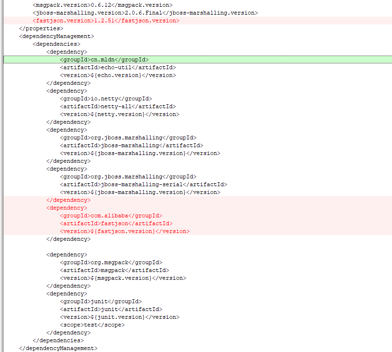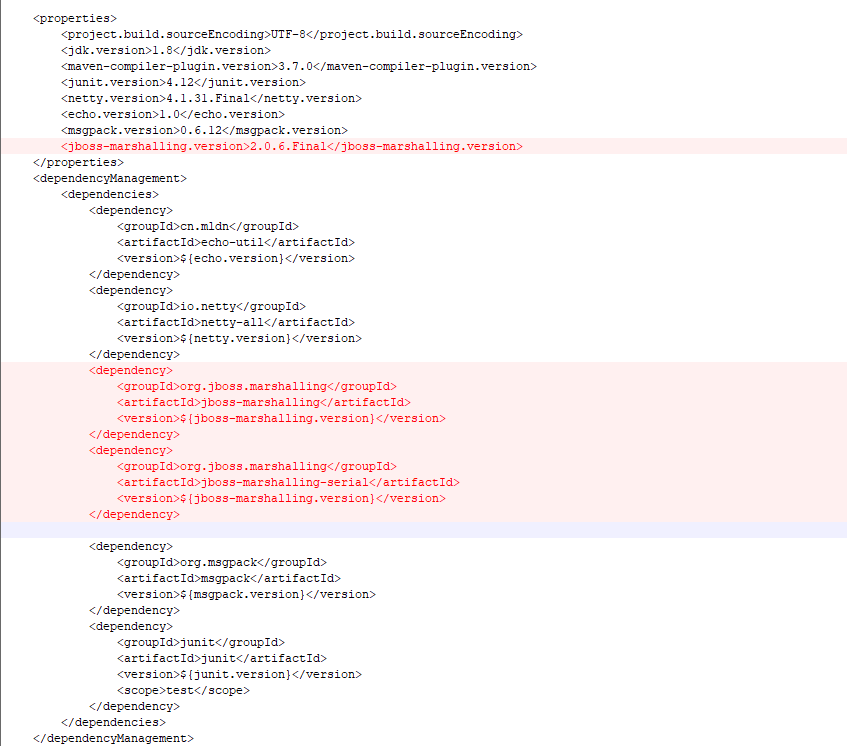 <?xml version="1.0" encoding="UTF-8"?> <project xmlns="http://maven.apache.org/POM/4.0.0" xmlns:xsi="http://www.w3.org/2001/XMLSchema-instance" xsi:schemaLocation="http://maven.apache.org/POM/4.0.0 http://maven.apache.org/xsd/maven-4.0.0.xsd"> <parent> <artifactId>echo</artifactId> <groupId>cn.mldn</groupId> <version>1.0</version> </parent> <modelVersion>4.0.0</modelVersion> <artifactId>echo-netty</artifactId> <packaging>jar</packaging> <dependencies> <dependency> <groupId>io.netty</groupId> <artifactId>netty-all</artifactId> </dependency> <dependency> <groupId>cn.mldn</groupId> <artifactId>echo-util</artifactId> </dependency> <dependency> <groupId>junit</groupId> <artifactId>junit</artifactId> <scope>test</scope> </dependency> <dependency> <groupId>org.jboss.marshalling</groupId> <artifactId>jboss-marshalling</artifactId> </dependency> <dependency> <groupId>org.jboss.marshalling</groupId> <artifactId>jboss-marshalling-serial</artifactId> </dependency> </dependencies> </project>