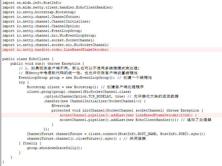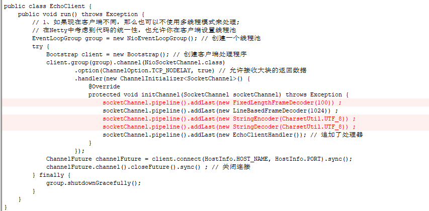 package com.bijian.netty.client; import com.bijian.netty.client.handler.EchoClientHandler; import com.bijian.netty.info.HostInfo; import io.netty.bootstrap.Bootstrap; import io.netty.channel.ChannelFuture; import io.netty.channel.ChannelInitializer; import io.netty.channel.ChannelOption; import io.netty.channel.EventLoopGroup; import io.netty.channel.nio.NioEventLoopGroup; import io.netty.channel.socket.SocketChannel; import io.netty.channel.socket.nio.NioSocketChannel; import io.netty.handler.codec.FixedLengthFrameDecoder; import io.netty.handler.codec.LineBasedFrameDecoder; import io.netty.handler.codec.string.StringDecoder; import io.netty.handler.codec.string.StringEncoder; import io.netty.util.CharsetUtil; public class EchoClient { public void run() throws Exception { // 1、如果现在客户端不同,那么也可以不使用多线程模式来处理; // 在Netty中考虑到代码的统一性,也允许你在客户端设置线程池 EventLoopGroup group = new NioEventLoopGroup(); // 创建一个线程池 try { Bootstrap client = new Bootstrap(); // 创建客户端处理程序 client.group(group).channel(NioSocketChannel.class) .option(ChannelOption.TCP_NODELAY, true) // 允许接收大块的返回数据 .handler(new ChannelInitializer<SocketChannel>() { @Override protected void initChannel(SocketChannel socketChannel) throws Exception { socketChannel.pipeline().addLast(new FixedLengthFrameDecoder(100)) ; socketChannel.pipeline().addLast(new LineBasedFrameDecoder(1024)) ; socketChannel.pipeline().addLast(new StringEncoder(CharsetUtil.UTF_8)) ; socketChannel.pipeline().addLast(new StringDecoder(CharsetUtil.UTF_8)) ; socketChannel.pipeline().addLast(new EchoClientHandler()); // 追加了处理器 } }); ChannelFuture channelFuture = client.connect(HostInfo.HOST_NAME, HostInfo.PORT).sync(); channelFuture.channel().closeFuture().sync() ; // 关闭连接 } finally { group.shutdownGracefully(); } } }