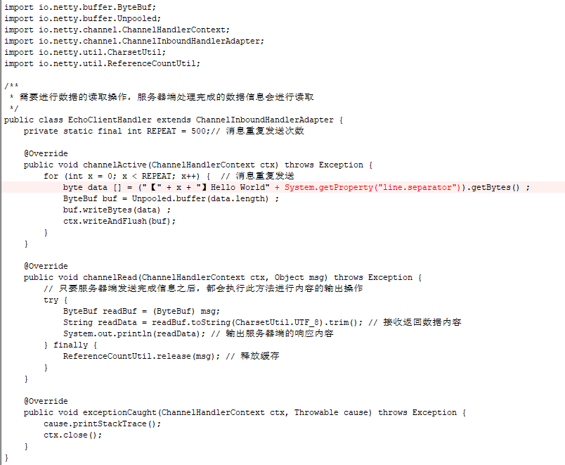 package com.bijian.netty.client.handler; import com.bijian.netty.util.InputUtil; import io.netty.buffer.ByteBuf; import io.netty.buffer.Unpooled; import io.netty.channel.ChannelHandlerContext; import io.netty.channel.ChannelInboundHandlerAdapter; import io.netty.util.CharsetUtil; import io.netty.util.ReferenceCountUtil; /** * 需要进行数据的读取操作,服务器端处理完成的数据信息会进行读取 */ public class EchoClientHandler extends ChannelInboundHandlerAdapter { private static final int REPEAT = 500;// 消息重复发送次数 @Override public void channelActive(ChannelHandlerContext ctx) throws Exception { for (int x = 0; x < REPEAT; x++) { // 消息重复发送 byte data [] = ("【" + x + "】Hello World" + System.getProperty("line.separator")).getBytes() ; ByteBuf buf = Unpooled.buffer(data.length) ; buf.writeBytes(data) ; ctx.writeAndFlush(buf); } } @Override public void channelRead(ChannelHandlerContext ctx, Object msg) throws Exception { // 只要服务器端发送完成信息之后,都会执行此方法进行内容的输出操作 try { ByteBuf readBuf = (ByteBuf) msg; String readData = readBuf.toString(CharsetUtil.UTF_8).trim(); // 接收返回数据内容 System.out.println(readData); // 输出服务器端的响应内容 } finally { ReferenceCountUtil.release(msg); // 释放缓存 } } @Override public void exceptionCaught(ChannelHandlerContext ctx, Throwable cause) throws Exception { cause.printStackTrace(); ctx.close(); } }