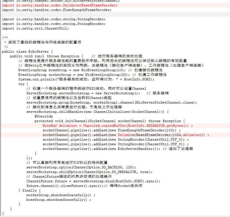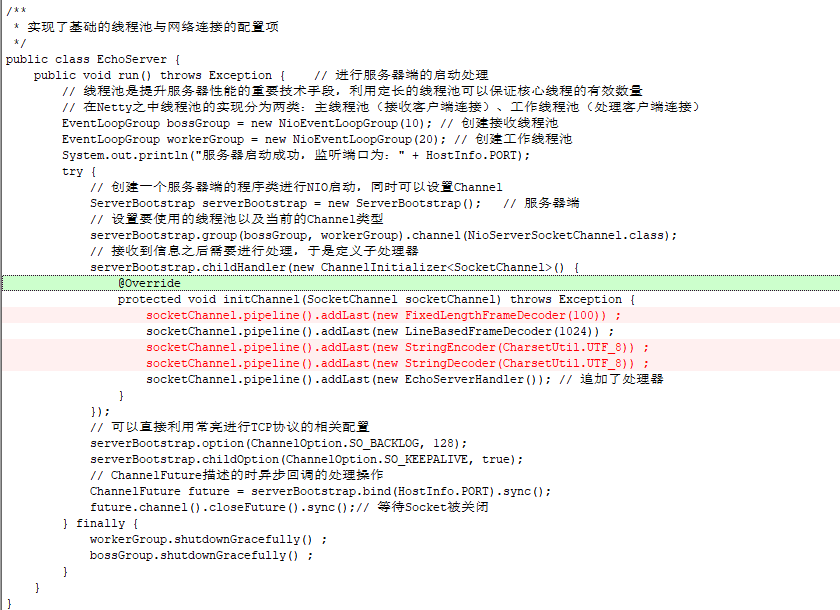 package com.bijian.netty.server; import com.bijian.netty.info.HostInfo; import com.bijian.netty.server.handler.EchoServerHandler; import io.netty.bootstrap.ServerBootstrap; import io.netty.channel.ChannelFuture; import io.netty.channel.ChannelInitializer; import io.netty.channel.ChannelOption; import io.netty.channel.EventLoopGroup; import io.netty.channel.nio.NioEventLoopGroup; import io.netty.channel.socket.SocketChannel; import io.netty.channel.socket.nio.NioServerSocketChannel; import io.netty.handler.codec.FixedLengthFrameDecoder; import io.netty.handler.codec.LineBasedFrameDecoder; import io.netty.handler.codec.string.StringDecoder; import io.netty.handler.codec.string.StringEncoder; import io.netty.handler.codec.FixedLengthFrameDecoder; import io.netty.handler.codec.LineBasedFrameDecoder; import io.netty.handler.codec.string.StringDecoder; import io.netty.handler.codec.string.StringEncoder; import io.netty.util.CharsetUtil; /** * 实现了基础的线程池与网络连接的配置项 */ public class EchoServer { public void run() throws Exception { // 进行服务器端的启动处理 // 线程池是提升服务器性能的重要技术手段,利用定长的线程池可以保证核心线程的有效数量 // 在Netty之中线程池的实现分为两类:主线程池(接收客户端连接)、工作线程池(处理客户端连接) EventLoopGroup bossGroup = new NioEventLoopGroup(10); // 创建接收线程池 EventLoopGroup workerGroup = new NioEventLoopGroup(20); // 创建工作线程池 System.out.println("服务器启动成功,监听端口为:" + HostInfo.PORT); try { // 创建一个服务器端的程序类进行NIO启动,同时可以设置Channel ServerBootstrap serverBootstrap = new ServerBootstrap(); // 服务器端 // 设置要使用的线程池以及当前的Channel类型 serverBootstrap.group(bossGroup, workerGroup).channel(NioServerSocketChannel.class); // 接收到信息之后需要进行处理,于是定义子处理器 serverBootstrap.childHandler(new ChannelInitializer<SocketChannel>() { @Override protected void initChannel(SocketChannel socketChannel) throws Exception { socketChannel.pipeline().addLast(new FixedLengthFrameDecoder(100)) ; socketChannel.pipeline().addLast(new LineBasedFrameDecoder(1024)) ; socketChannel.pipeline().addLast(new StringEncoder(CharsetUtil.UTF_8)) ; socketChannel.pipeline().addLast(new StringDecoder(CharsetUtil.UTF_8)) ; socketChannel.pipeline().addLast(new EchoServerHandler()); // 追加了处理器 } }); // 可以直接利用常亮进行TCP协议的相关配置 serverBootstrap.option(ChannelOption.SO_BACKLOG, 128); serverBootstrap.childOption(ChannelOption.SO_KEEPALIVE, true); // ChannelFuture描述的时异步回调的处理操作 ChannelFuture future = serverBootstrap.bind(HostInfo.PORT).sync(); future.channel().closeFuture().sync();// 等待Socket被关闭 } finally { workerGroup.shutdownGracefully() ; bossGroup.shutdownGracefully() ; } } }