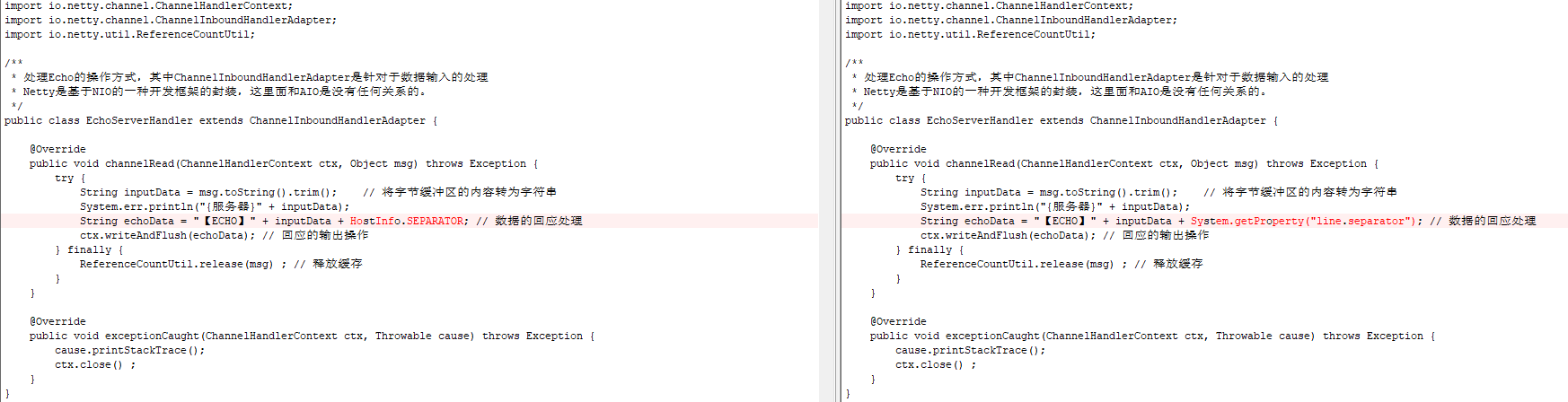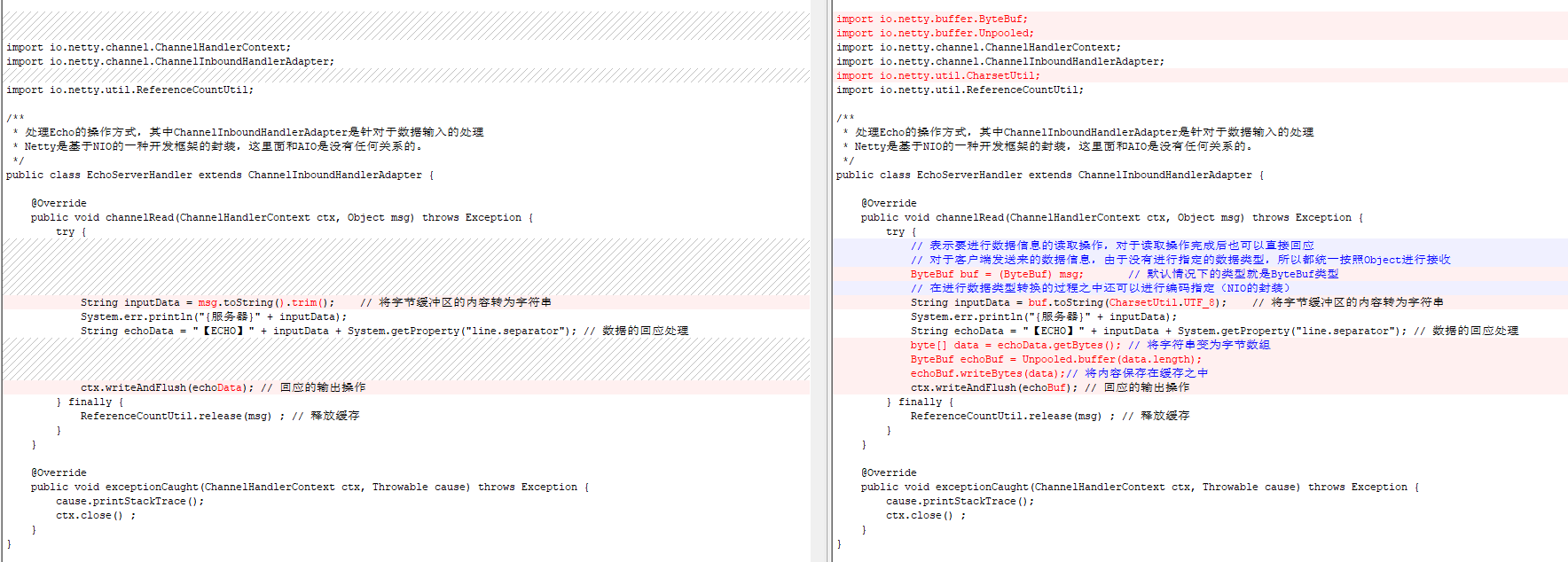 package com.bijian.netty.server.handler; import com.bijian.netty.info.HostInfo; import io.netty.channel.ChannelHandlerContext; import io.netty.channel.ChannelInboundHandlerAdapter; import io.netty.util.ReferenceCountUtil; /** * 处理Echo的操作方式,其中ChannelInboundHandlerAdapter是针对于数据输入的处理 * Netty是基于NIO的一种开发框架的封装,这里面和AIO是没有任何关系的。 */ public class EchoServerHandler extends ChannelInboundHandlerAdapter { @Override public void channelRead(ChannelHandlerContext ctx, Object msg) throws Exception { try { String inputData = msg.toString().trim(); // 将字节缓冲区的内容转为字符串 System.err.println("{服务器}" + inputData); String echoData = "【ECHO】" + inputData + HostInfo.SEPARATOR; // 数据的回应处理 ctx.writeAndFlush(echoData); // 回应的输出操作 } finally { ReferenceCountUtil.release(msg) ; // 释放缓存 } } @Override public void exceptionCaught(ChannelHandlerContext ctx, Throwable cause) throws Exception { cause.printStackTrace(); ctx.close() ; } }