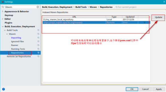 我们可以更新一下本地仓库和远程仓库,这个样在pom.xml文件中添加依赖jia包的坐标时就可以很好的提示出来。