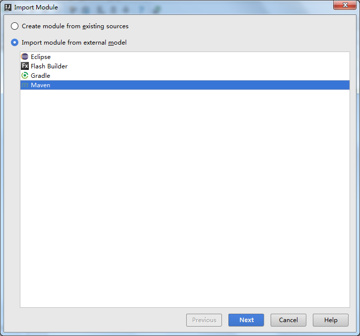 File -> New -> Module form existing code,然后选择Maven,点击Next。