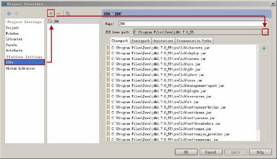 (3)若中间的SDK列表框没有选项,则单击“+”号创建一个JDK列表项;