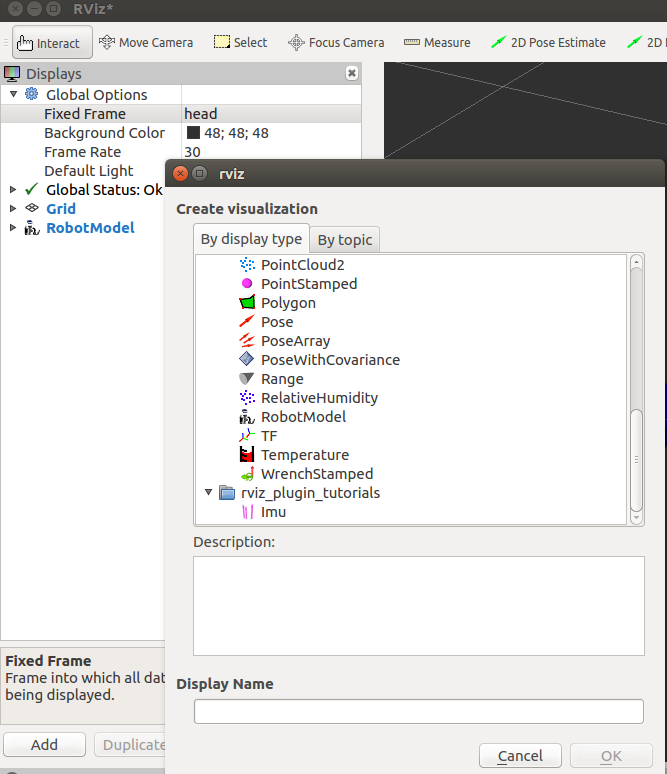 启动后是没有模型的,需要增加模型,点左边的add,选择RobotModel如图