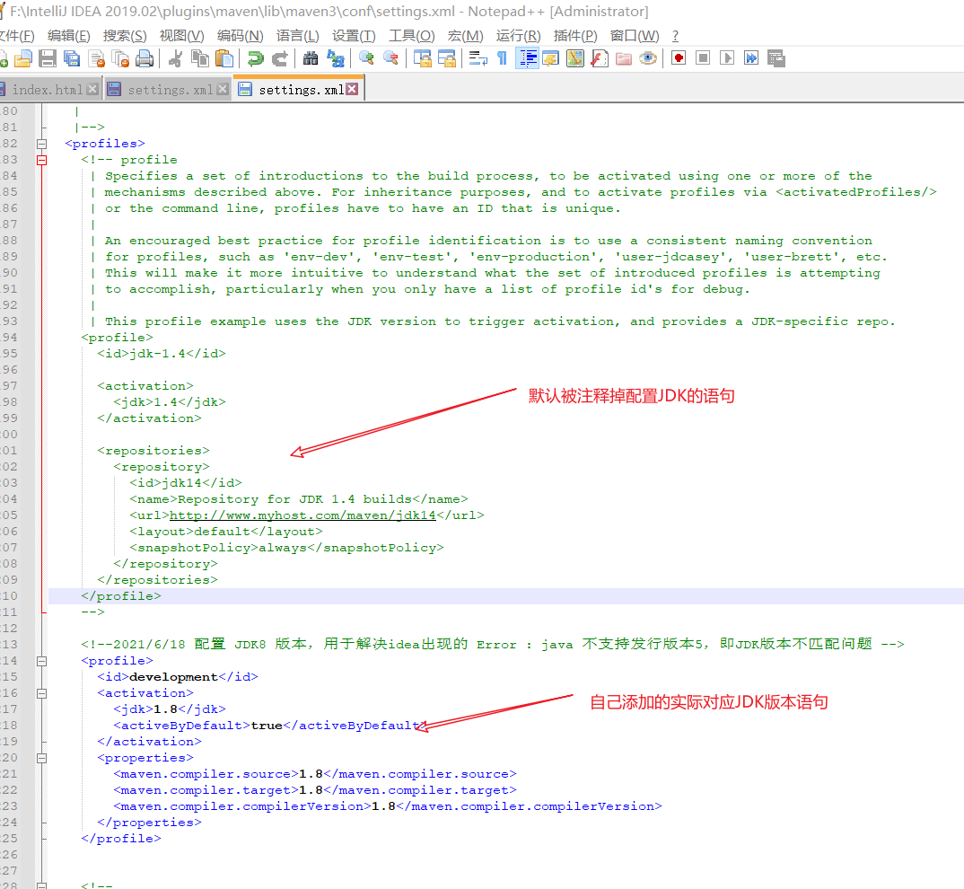除了在idea的设置和项目设置里查看对应的JDK版本是否一致之外,还可以采用修改maven配置文件的方式(一劳永逸),在maven配置文件里面也有对应的语句,但是默认被注释掉了,我们可根据实际使用的JDK版本进行修改和取消注释。