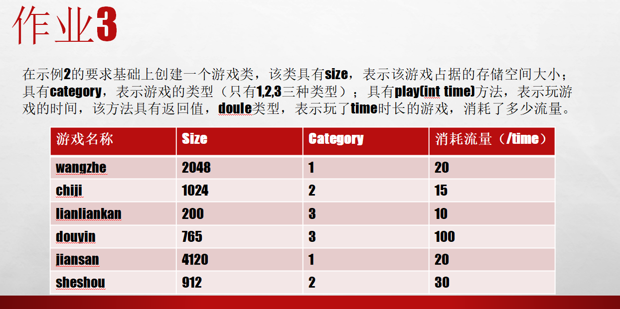 Game类中的play方法,需要你上传一个时间time,然后计算所消耗的流量,有的同学被题目要求的说法绕晕了,time是上传的参数,而方法的返回值是消耗的流量,方法在返回一个值的时候只能返回一个值。
