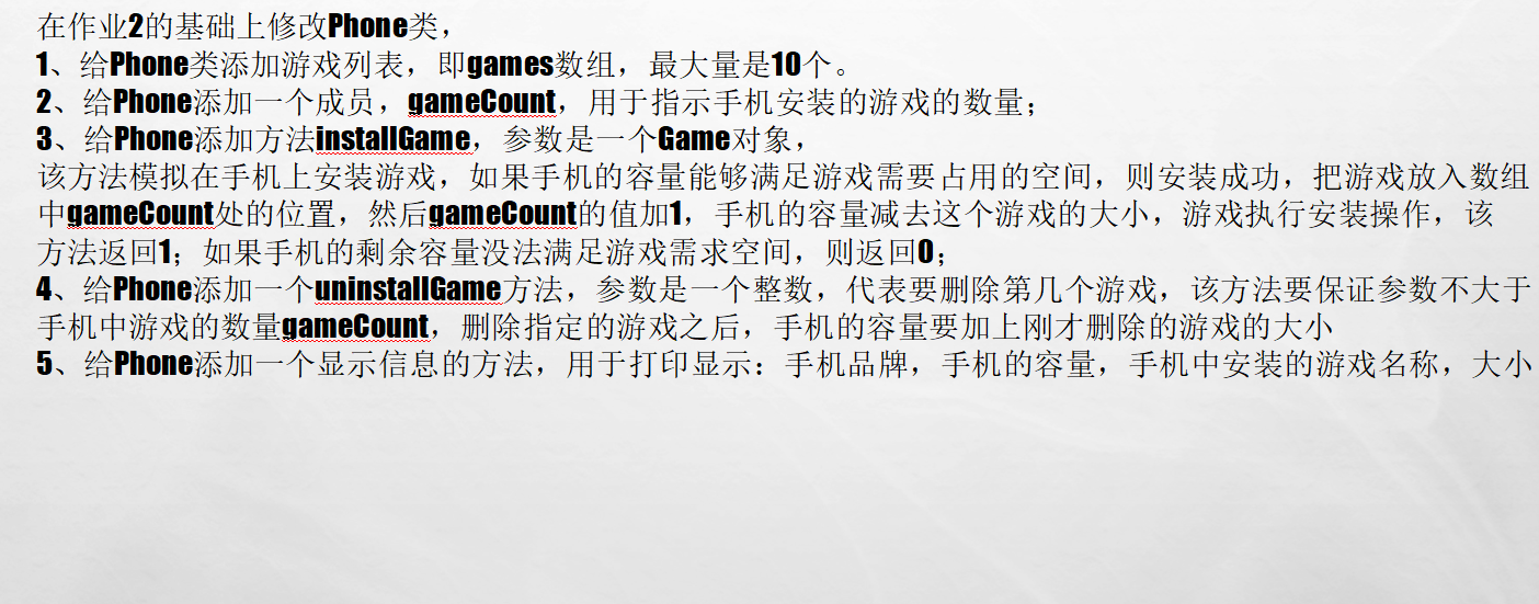 最后一条要求,前两项好解决,最后一项要求就是把games数组从头到尾遍历一遍,将里面还保存着的游戏输出出来,这里有的同学不知道怎么把游戏名字输出,我这里提供一个思路:在Game类中添加一个字符串类型的变量,用来存储游戏名(假设变量名为name),在前面安装游戏时不要忘记把games【i】.name更新上,这样在遍历时就可以直接输出游戏名了。