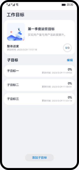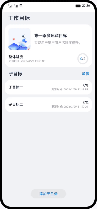如图4所示,在目标管理应用中,当用户点击子目标列表的“编辑”文本,列表进入编辑模式,点击取消,列表退出编辑模式。