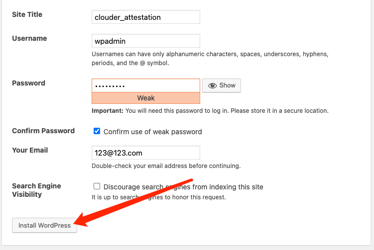 2、在弹出欢迎页上配置相关信息,点击Install Wordpress。 相关信息配置如下: