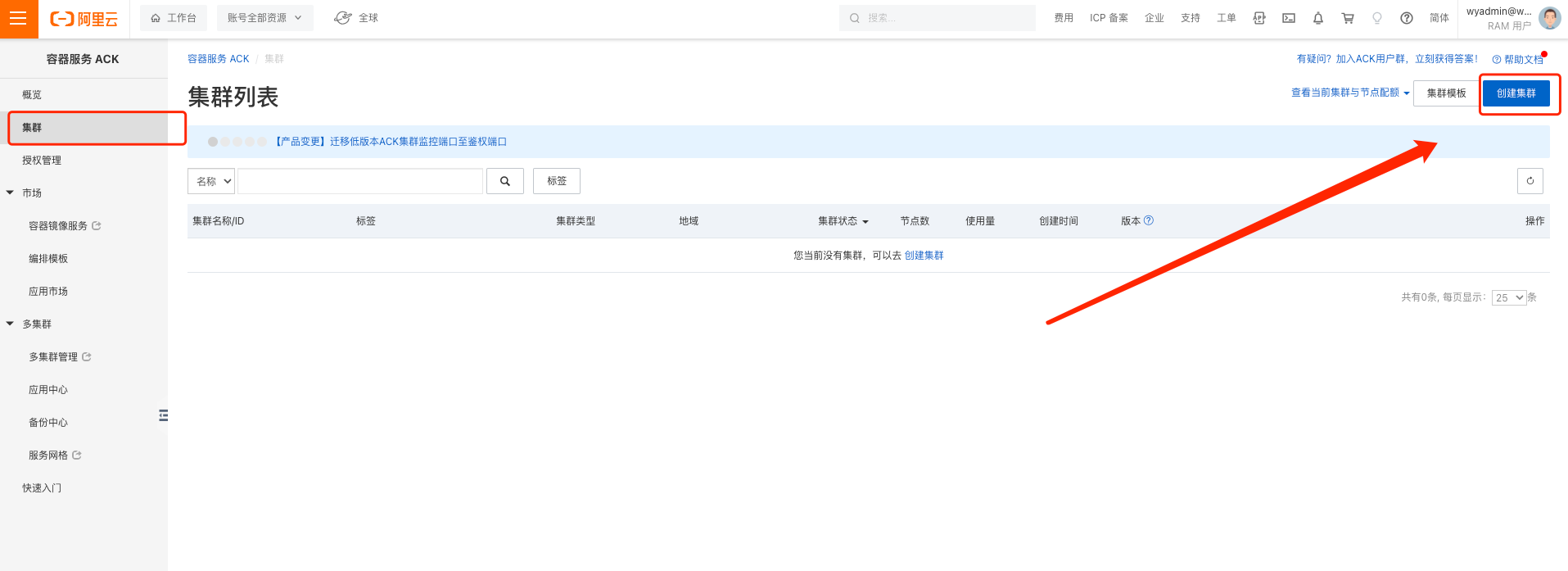 创建存储卷(PV)和存储声明(PVC)【说明】为了实现用户数据持久化存储,我们需提前定义PV和PVC。PV是对存储资源的抽象,可将存储定义为一种容器应用可以直接使用的资源,而PVC定义了应用对存储资源的申请。 1、在 容器服务ACK 控制台,左侧导航栏点击 集群 进入到集群列表页面,确认集群状态为运行中,点击 集群名称 进入集群管理控制台。