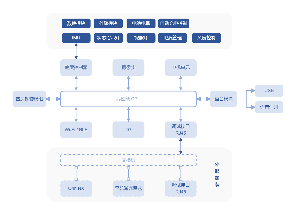 H1 机载标配 1 块【运控计算单元】,1 块【开发计算单元】,并且可选配一块【开发计算单元】。