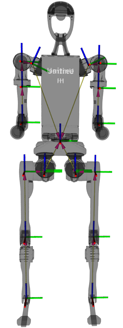 H1整机分为上半身和下半身,具备多个自由度。单手臂拥有 4 个自由度,包括身肩关节、肩关节、上臂关节和手肘关节。单腿拥有 5 个自由度,包括胯关节、腿关节、髋关节、膝关节和踝关节。腰部具备 1 个自由度,即腰关节。整机共有 19 个自由度,由 19 个关节电机组成,使得机器人能够实现精确的运动和姿态控制。