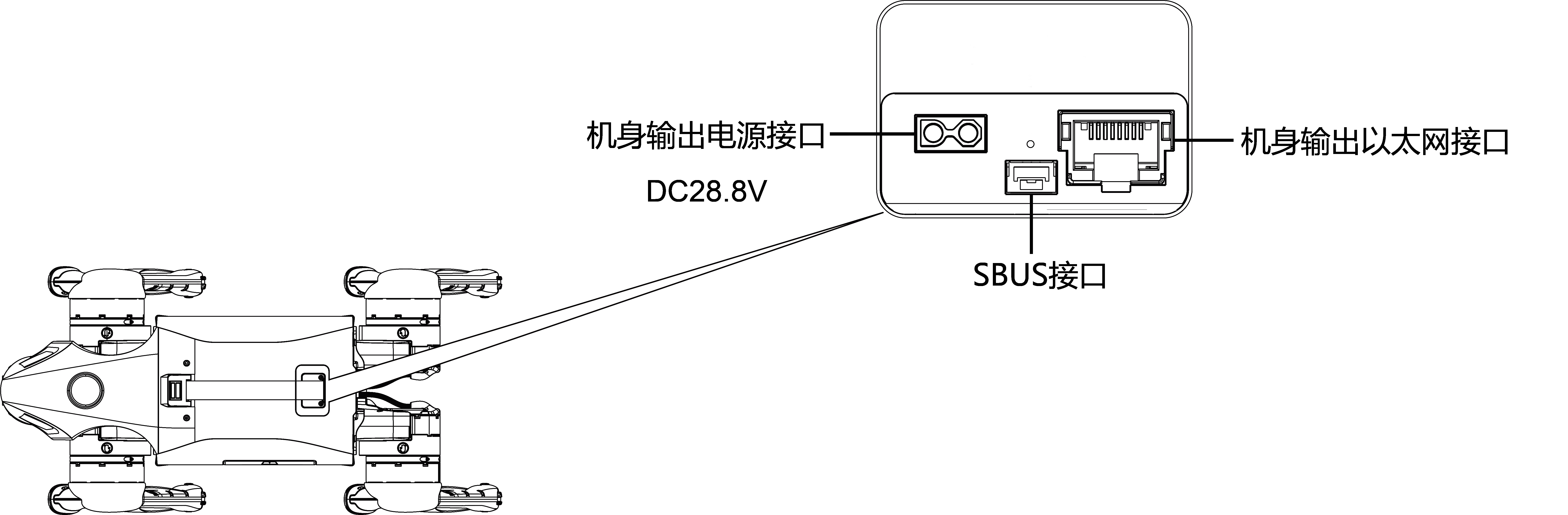 H1 的右侧配备了电气接口,这些接口用于连接各个机身关节电机、传感器外设、网口等。这样的设计使您能够方便地进行调试、排查问题以及进行二次开发。