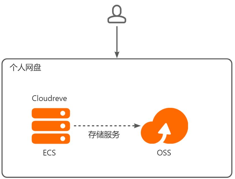 个人网盘架构本实验使用ECS安装Cloudreve提供网盘服务,OSS提供存储服务。当用户使用个人网盘时,访问部署Cloudreve ECS的公网IP地址即可完成文件上传、下载、删除、分享等服务。