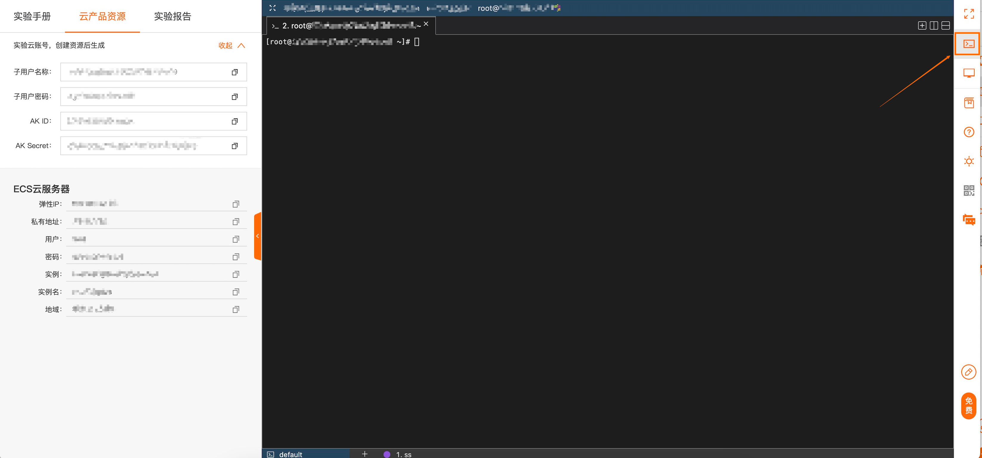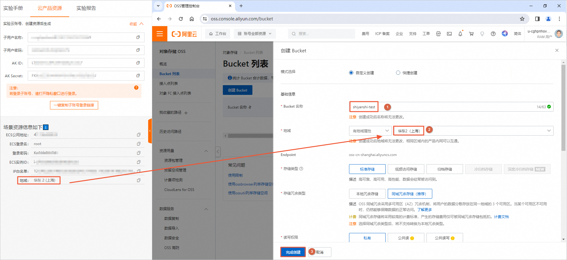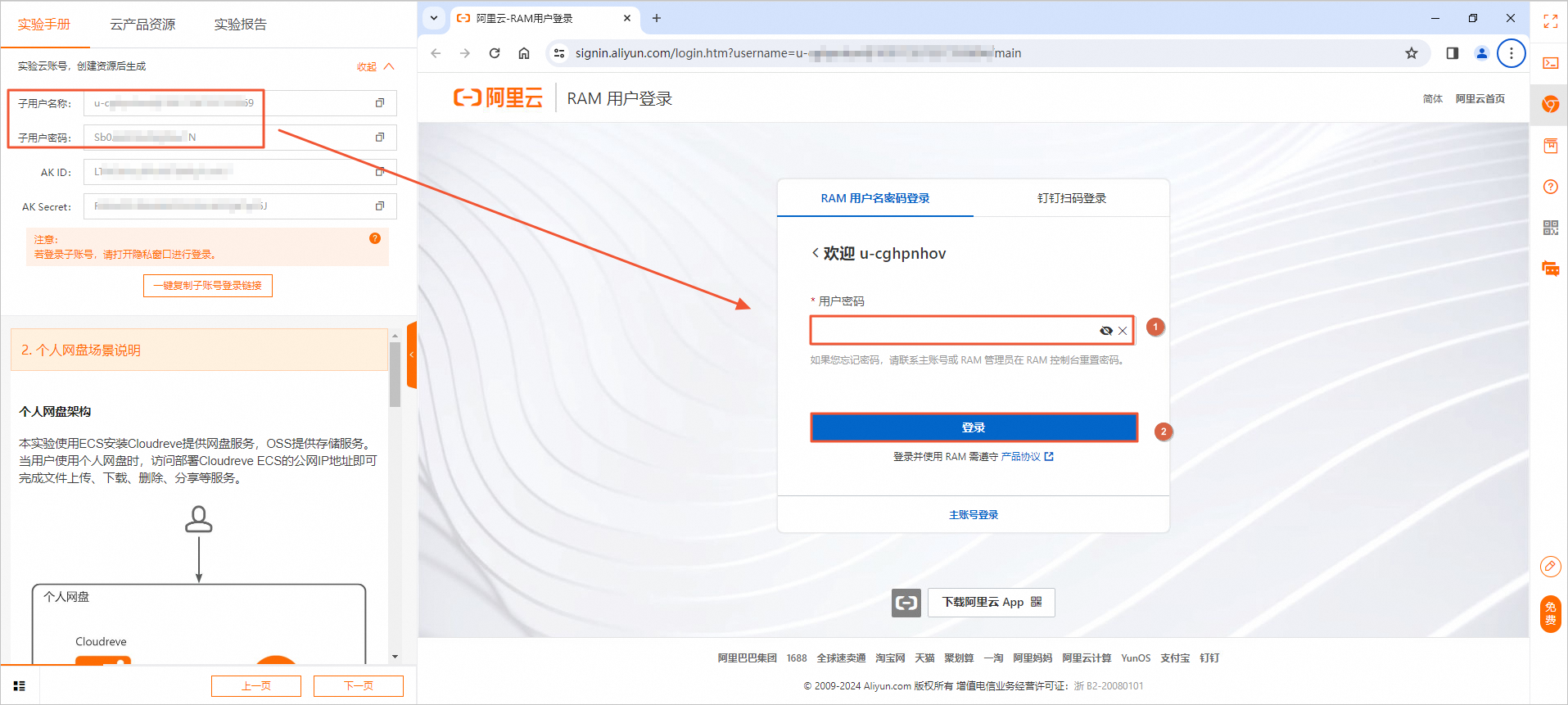说明:您可以在实验室左侧获取子用户名称和子用户密码。