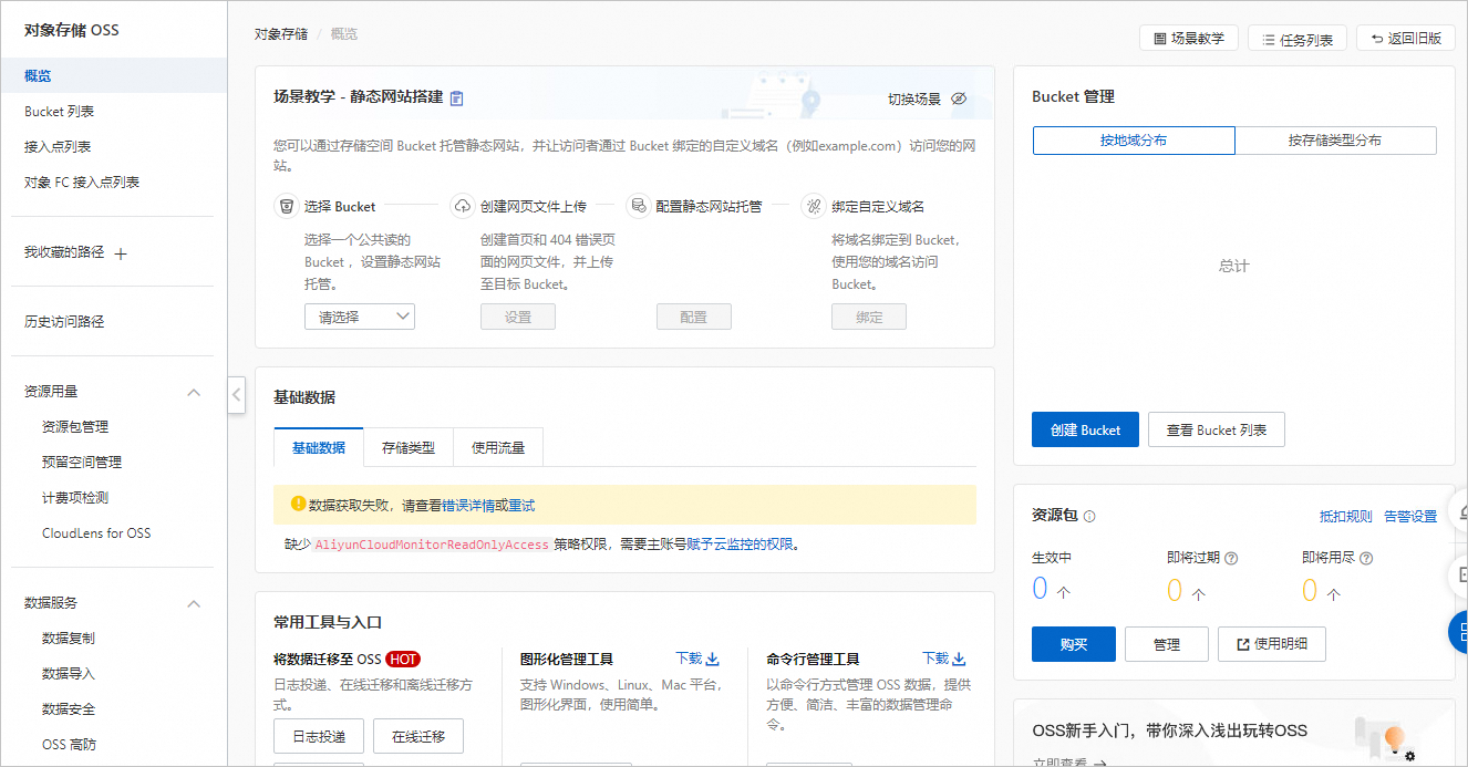 返回如下页面,表示您已经进入对象存储OSS管理控制台。