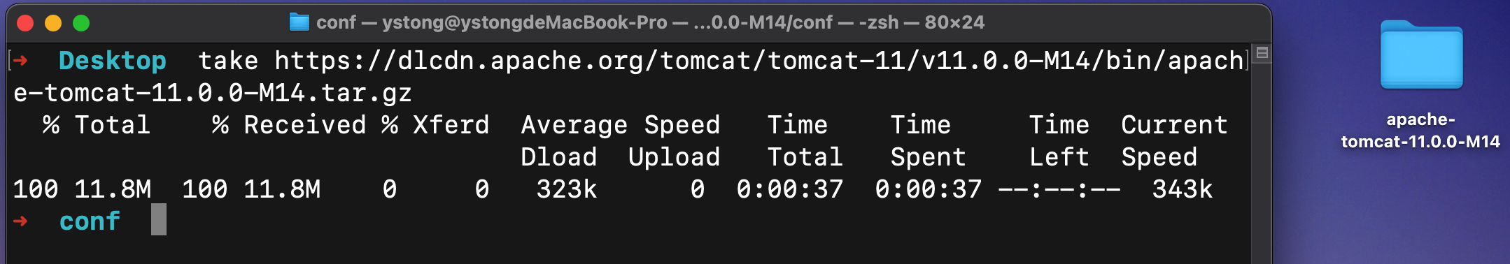 通过上图可以看出会自动下载tomcat文件并解压提取,最后还自动切换到了conf目录中。
