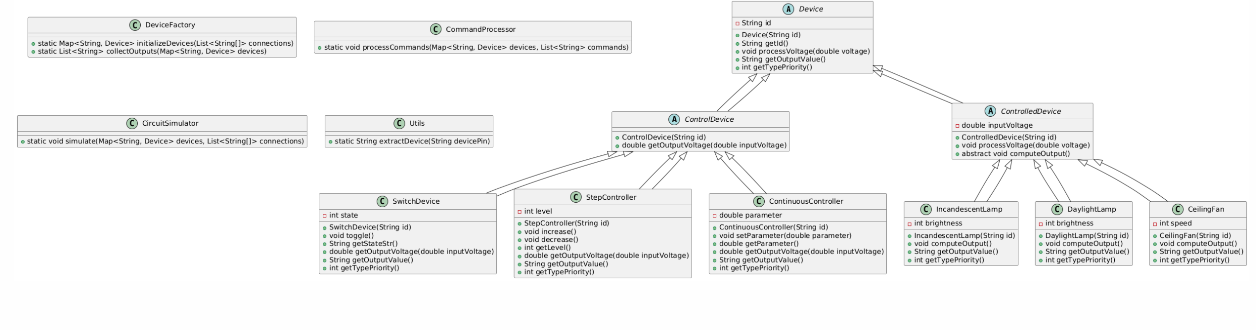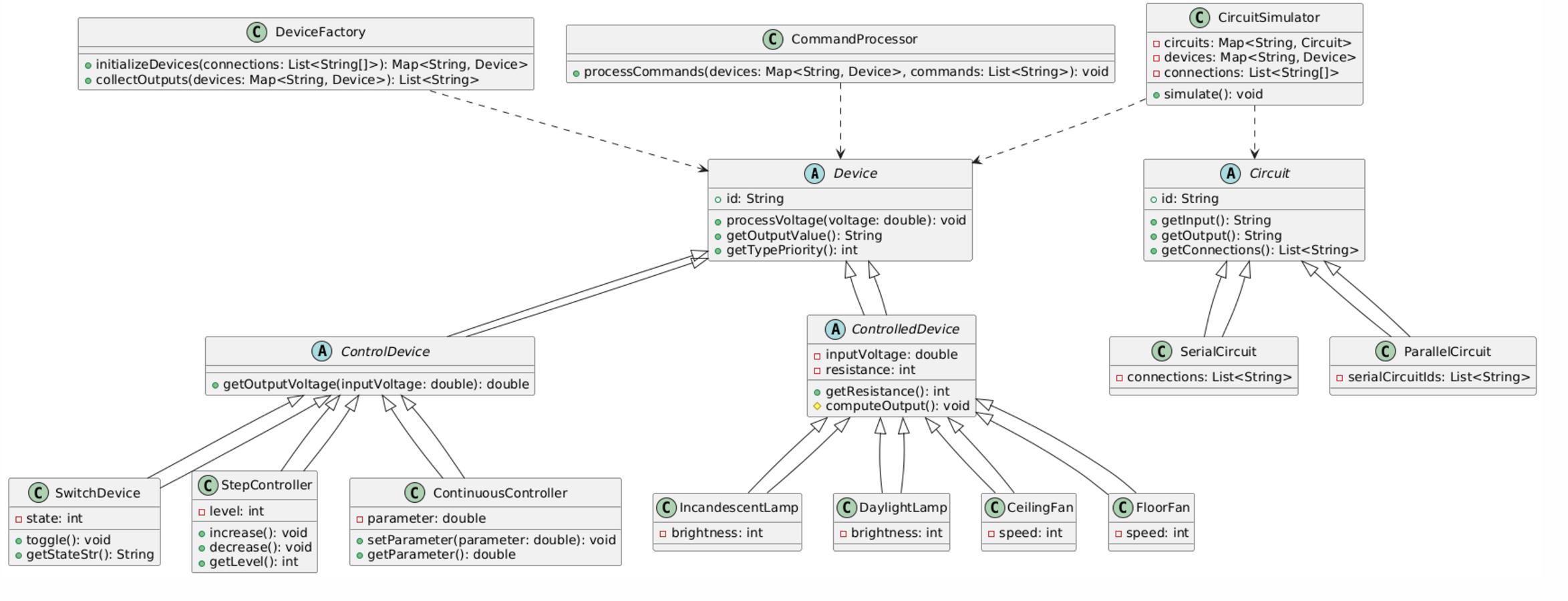 Device的抽象接口processVoltage和getOutputValue实现了设备行为的动态绑定,增强了系统的灵活性。 - 不同设备根据其类型实现了各自的电压处理逻辑,满足“开闭原则”(对扩展开放,对修改封闭)。