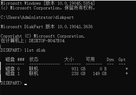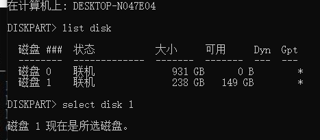4.select disk 1 打开Ubuntu系统坐在的磁盘