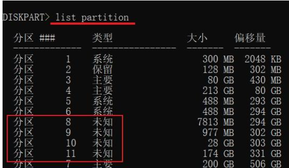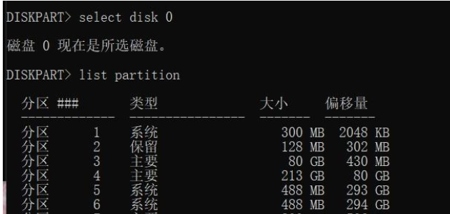 5.select partition 1(1为win下系统类型分区所对应的分区ID)