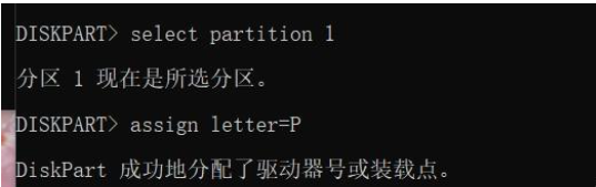 →assign letter=P.(不要关闭界面)选择其系统分区并将其分配给一个磁盘P(任意一个不与现有磁盘冲突的就行),