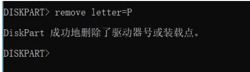 8.进入前面的操作界面,输入remove letter=P;删除P盘即可