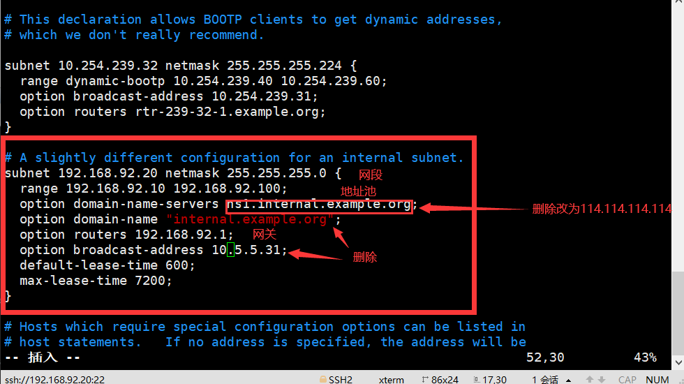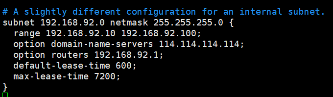 vim dhcpd.conf //进入dhcpd.conf文件(此图修改过但不完整请根据自己的网络修改,完全修改完的在下图)