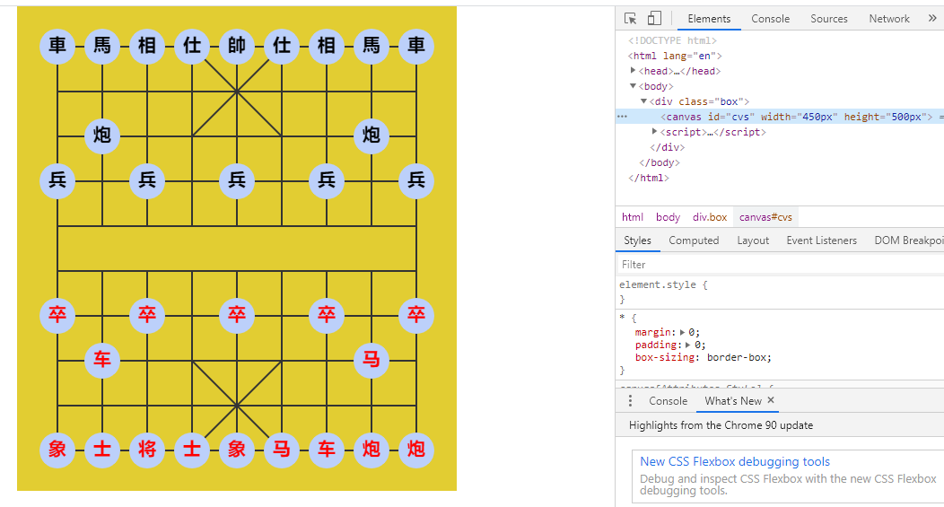<!DOCTYPE html> <html lang="en"> <head> <meta charset="UTF-8"> <meta http-equiv="X-UA-Compatible" content="IE=edge"> <meta name="viewport" content="width=device-width, initial-scale=1.0"> <style> * { margin: 0; padding: 0; box-sizing: border-box; } .box { width: 490px; height: 540px; background-color: #e2cd32; margin: 0 auto; padding: 20px; } </style> <title>纯用canvas绘制的象棋棋盘</title> </head> <body> <!-- 页面标签 --> <div class="box"> <canvas id="cvs" width="450px" height="500px"></canvas> </div> <script> const canvas = document.querySelector('#cvs'); const ctx = canvas.getContext('2d') // 定义线宽 const LineWidth = 2 // 定义颜色 const color = '#333' // 定义一个方格的尺寸 const size = 50 // 定义棋子半径 const r = 20 // 红色方棋子颜色 const color1 = 'red' // 黑色方棋子 const color2 = '#000' // 移动中心点 ctx.translate(25, 25) // 圆周率 const PI = Math.PI // 棋子背景色 const piecesColor = '#bcd0fa' // 绘线函数 function drawLine(x, y, x2, y2) { ctx.beginPath() ctx.moveTo(x * size, y * size) ctx.lineTo(x2 * size, y2 * size) ctx.strokeStyle = color ctx.lineWidth = LineWidth ctx.stroke() } // 绘制所有的横线 for (let i = 0; i < 10; i++) { drawLine(0, i, 8, i) } // 绘制上下半区的 竖线 for (let i = 0; i < 9; i++) { drawLine(i, 0, i, 4) drawLine(i, 5, i, 9) } // 1. 补全楚河汉界 两边的线 // 2. 补全boss所在区的斜线 const lineArr = [[0, 4, 0, 5], [8, 4, 8, 5], [3, 0, 5, 2], [5, 0, 3, 2], [], [3, 7, 5, 9], [5, 7, 3, 9]] lineArr.map(i => { drawLine(...i) }) // 绘制棋子函数 function drawPieces(x, y, font, type) { // 绘制棋格 ctx.beginPath() ctx.moveTo(x * size, y * size) ctx.arc(x * size, y * size, r, 0, 2 * PI) ctx.fillStyle = piecesColor ctx.fill() ctx.closePath() const c = type ? color1 : color2 // 绘制棋子 ctx.font = '600 20px 微软雅黑' // ctx.fontSize = 3 ctx.textAlign = 'center' ctx.textBaseline = 'middle' ctx.fillStyle = c ctx.fillText(font, x * size, y * size) } // 绘制棋子 const pieces = [[0, 0, '車', 0], [1, 0, '馬', 0], [2, 0, '相', 0], [3, 0, '仕', 0], [4, 0, '帥', 0], [5, 0, '仕', 0], [6, 0, '相', 0], [7, 0, '馬', 0], [8, 0, '車', 0], [0, 3, '兵', 0], [2, 3, '兵', 0], [4, 3, '兵', 0], [6, 3, '兵', 0], [8, 3, '兵', 0], [1, 2, '炮', 0], [7, 2, '炮', 0], [0, 6, '卒', 1], [2, 6, '卒', 1], [4, 6, '卒', 1], [6, 6, '卒', 1], [8, 6, '卒', 1], [1, 7, '车', 1], [7, 7, '马', 1], [0, 9, '象', 1], [1, 9, '士', 1], [2, 9, '将', 1], [3, 9, '士', 1], [4, 9, '象', 1], [5, 9, '马', 1], [6, 9, '车', 1], [7, 9, '炮', 1], [8, 9, '炮', 1]] pieces.map(i => { drawPieces(...i) }) </script> </body> </html>