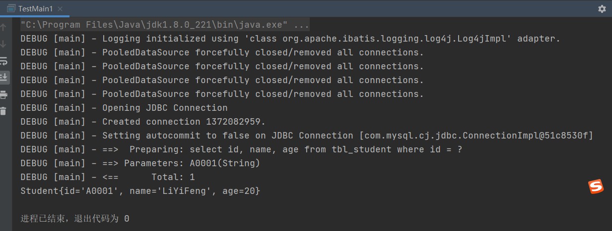 package com.fmg.test; import com.fmg.domain.Student; import org.apache.ibatis.io.Resources; import org.apache.ibatis.session.SqlSession; import org.apache.ibatis.session.SqlSessionFactory; import org.apache.ibatis.session.SqlSessionFactoryBuilder; import java.io.IOException; import java.io.InputStream; public class TestMain1 { public static void main(String[] args) { String resource = "mybatis-config.xml"; InputStream inputStream = null; try { inputStream = Resources.getResourceAsStream(resource); } catch (IOException e) { e.printStackTrace(); } SqlSessionFactory sqlSessionFactory = new SqlSessionFactoryBuilder().build(inputStream); SqlSession session = sqlSessionFactory.openSession(); Student stu = session.selectOne("test1.selectById", "A0001"); System.out.println(stu); } }