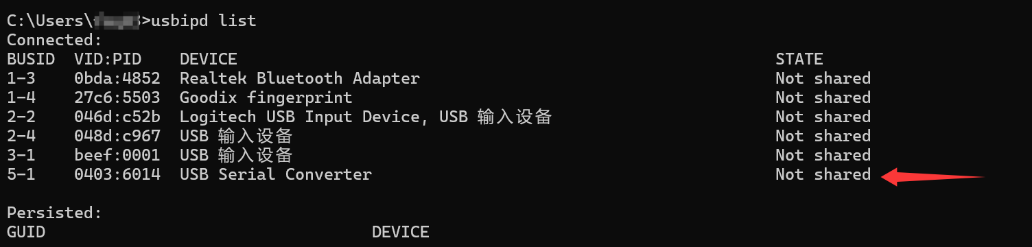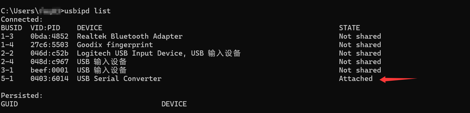 此时再使用usbipd list查询,可以看到设备已经被attached: