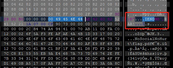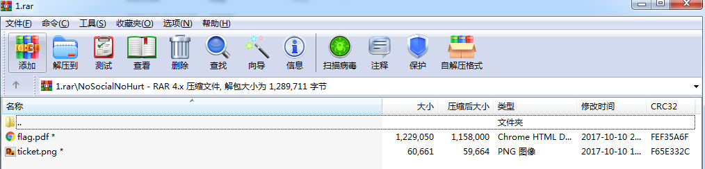png图片后面果然有文件,像是RAR文件,但是文件头不对,将52 41 52后面的内容重新复制到1.RAR中,发现打不开,修改文件头为52 61 72后,文件变为正常的RAR文件。