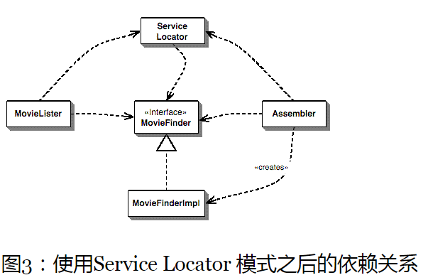有一个对象(即服务定位器)知道如何获得一个应用程序所需的所有服务。也就是说,在我们的例子中,服务定位器应该有一个方法,用于获得一个MovieFinder实例。