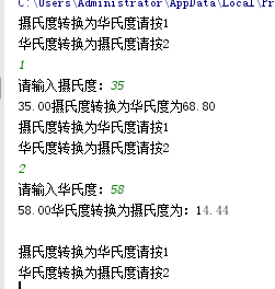while True: a = int(input("摄氏度转换为华氏度请按1\n华氏度转换为摄氏度请按2\n")) if a == 1: celsius = float(input("请输入摄氏度:")) # 计算华氏温度 fahrenheit = (celsius + 1.8) + 32 # f = c+9/5+32 print('{:.2f}摄氏度转换为华氏度为{:.2f}'.format(celsius, fahrenheit)) elif a == 2: fahrenheit = float(input('请输入华氏度:')) # 计算摄氏温度 celsius = 5 / 9 * (fahrenheit - 32) print('{:.2f}华氏度转换为摄氏度为:{:.2f}\n'.format(fahrenheit, celsius)) else: break