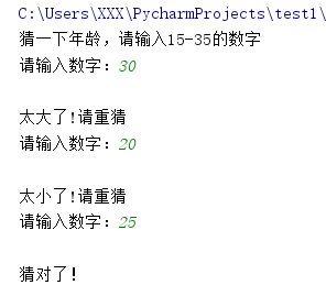 num=25 print("猜一下年龄,请输入15-35的数字") while True: num1= int(input("请输入数字:")) if num1 > num: print("\n太大了!请重猜") elif num1 < num: print("\n太小了!请重猜") else: print("\n猜对了!") break