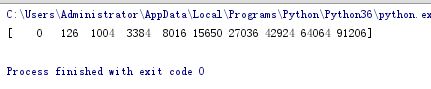 import numpy def npSum(n): a=numpy.arange(n) b=numpy.arange(0,5*n,5) c=a**2+b**3 return(c) print(npSum(10))