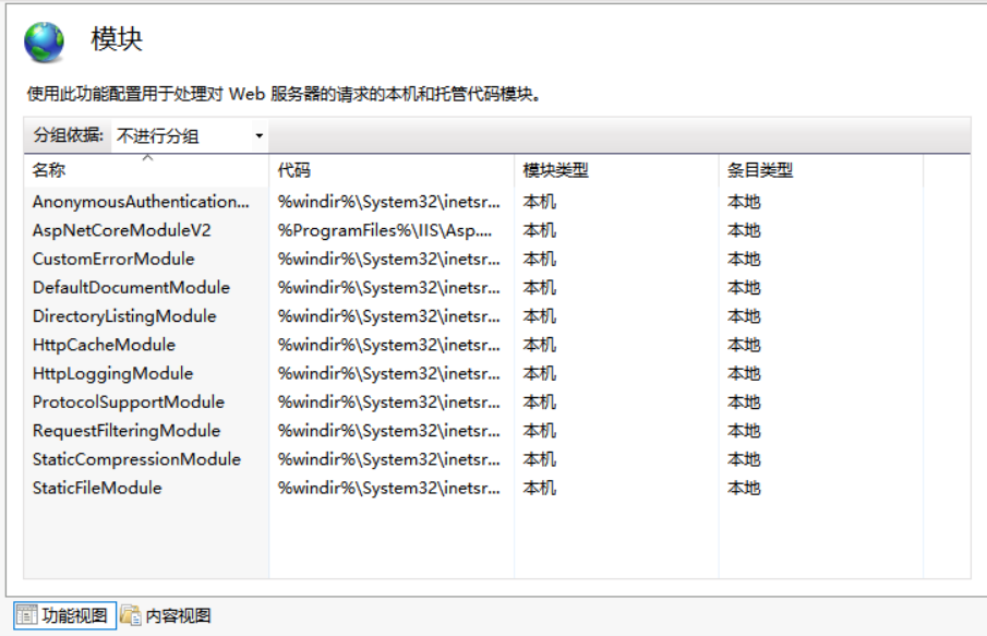 安装完成后在IIS管理界面,找到模块可看到如下图表示安装成功,此时再启动网页不在报错。