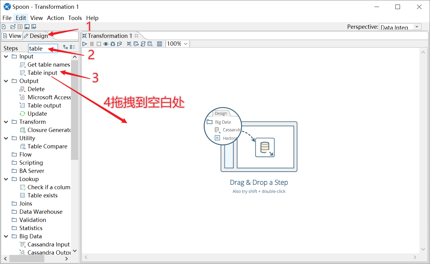 通常一个转换可以包含多个步骤,步骤之间的数据流向可以通过箭头表示。需要注意的是,转换如果运行起来,则所有的步骤也跟着并发执行。而数据是从箭头的起始流向箭头的末尾。