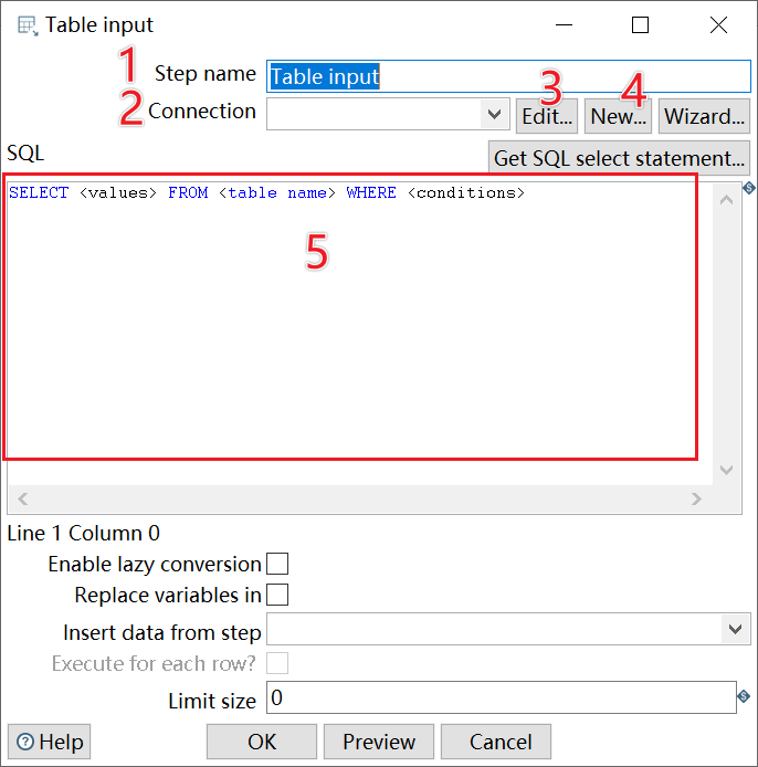 双击打开表输入(Table input)之后,大体的工作区域如下。下面分别对这5个常用的地方做介绍: